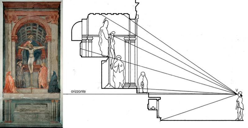Il primo fu Masaccio. Nel 1426 a Firenze all’interno di S.Maria Novella. Se il tuo sguardo coincide con quello che è il punto di fuga della costruzione, sei dentro il quadro e l’ambiente che viene dipinto. Nasce la prospettiva centrale in pittura.